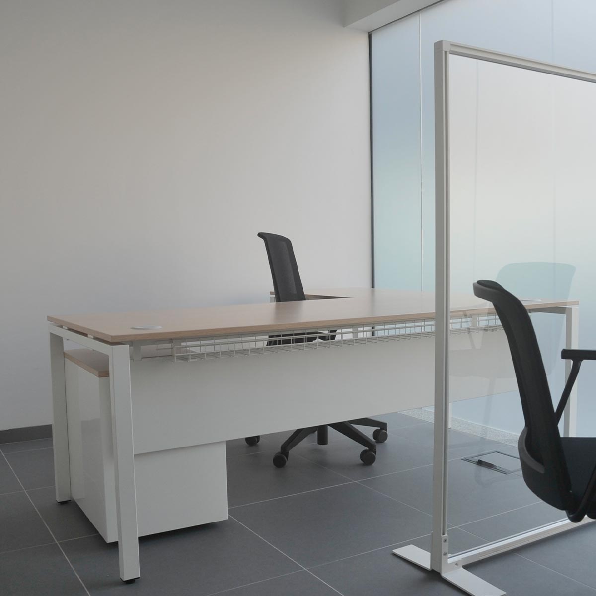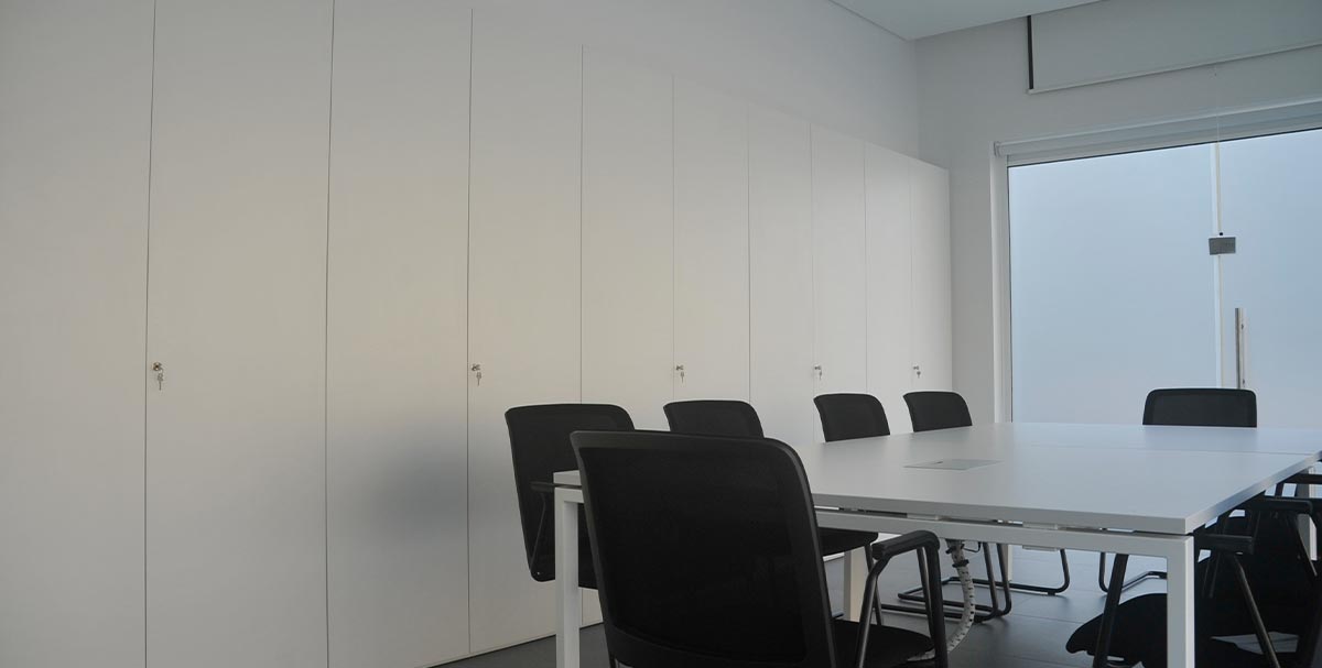 Fornecimento e montagem de mobiliário, composto por mesas de trabalho, cadeiras, armários, mesas de reunião e elementos de apoio.